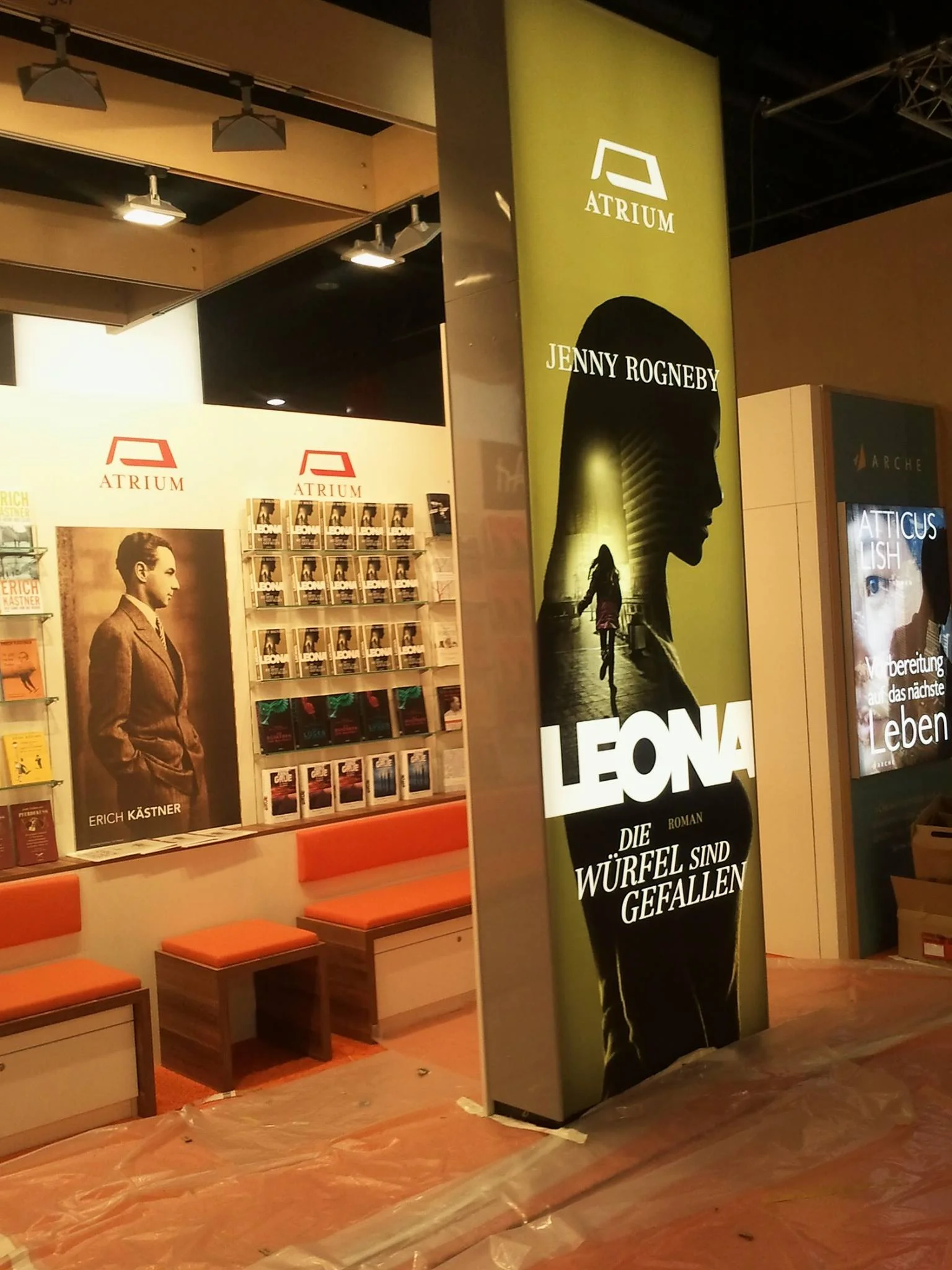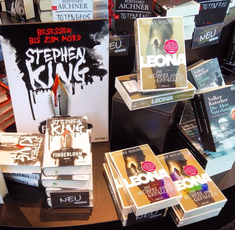 LEONA - Die wurfel sind gefallen displayed in the shop window at the large German bookstore chain "Mayersche Buchhandlung". Here in good company with Stephen King's new novel.